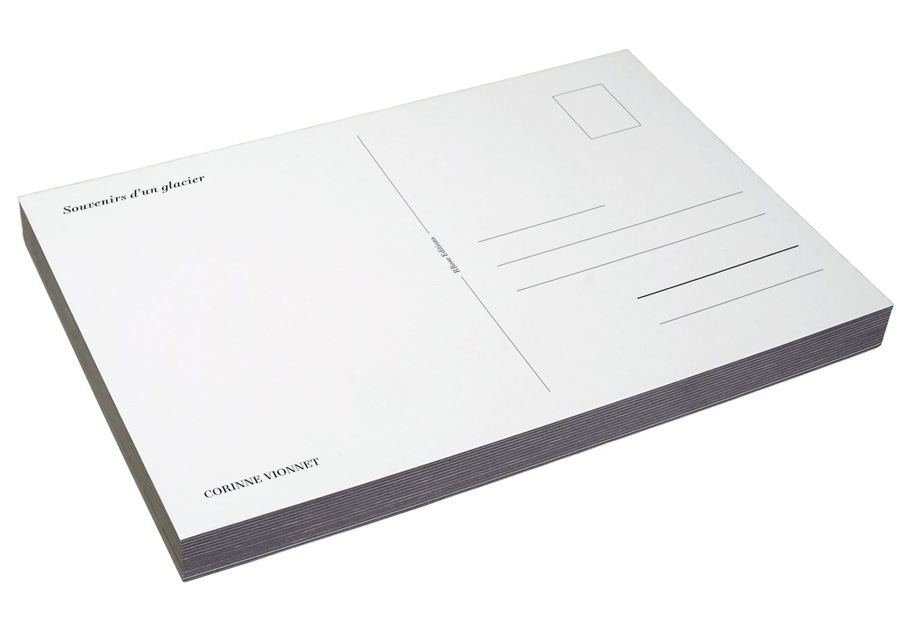Over the years, Corinne Vionnet has collected postcards of the Rhône glacier, spanning almost one century of images. Strikingly, but not so surprisingly, the pictures chosen have all been shot from the same perspective, from an "ideal" spot that reveals the glacier in its archetypal form and the roads that take us there - as is often the case with touristic attractions - a pattern of repetition and supersposition that Vionnet explored for instance in her Photo Opportunities series. There is a difference, however, between monuments as the Taj Mahal, the Rome Coliseum, the Eiffel Tower and landscapes as the Rhône glacier. The latter is not fixed in eternity.